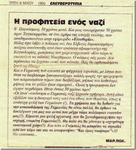 Επιβεβαιώθηκε η "προφητεία" των Ναζί ...Η ναζιστική "προφητεία", η οποία "έλεγε" ότι η ηττημένη Γερμανία κατά τη μεταπολεμική περίοδο θα χρηματοδοτούνταν αδρά, προκειμένου ν' αναπτυχθεί εις βάρος των θυμάτων της ...Ότι αυτά τα θύματα όχι μόνον δεν θα αποζημιώνονταν απ' αυτήν, αλλά αντίθετα θα πήγαιναν σαν "σκλάβοι" τής "αμνησίας" για να την "ξαναχτίσουν" με τα ίδια τους τα χέρια. Πώς να μην είναι οι Γερμανοί σίγουροι για την "αμνησία" των λαών, όταν μαζί με τους Αμερικανούς έλεγχαν τις ηγεσίες των ευρωπαϊκών κρατών, οι οποίες στην πλειοψηφία τους ήταν πρώην δωσίλογοι των Ναζί; Πώς να μην είναι σίγουροι για τον δικό τους Καραμανλή;